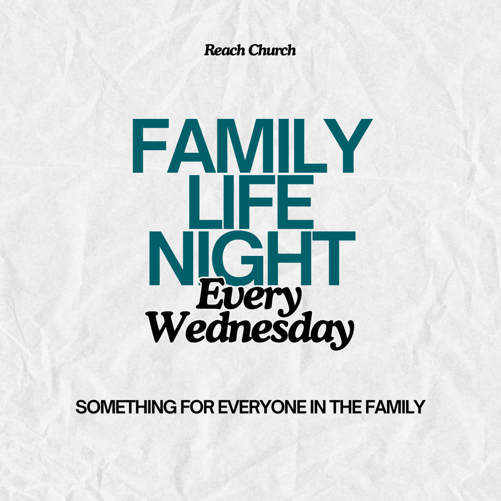 Join us every Wednesday at 6PM for Family Life Night at Reach Church! This is a special evening designed for all ages to grow in faith, strengthen relationships, and build community together.